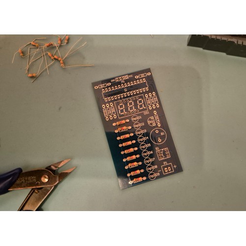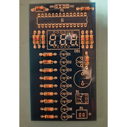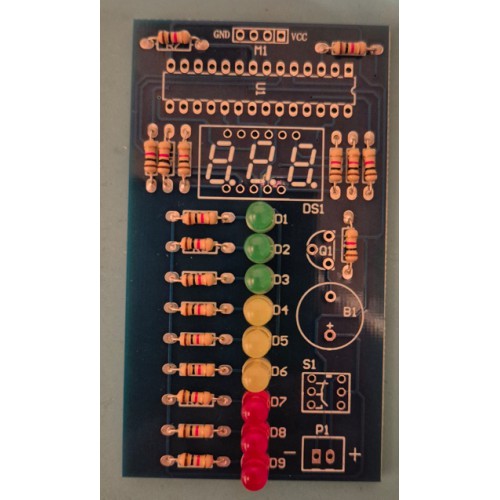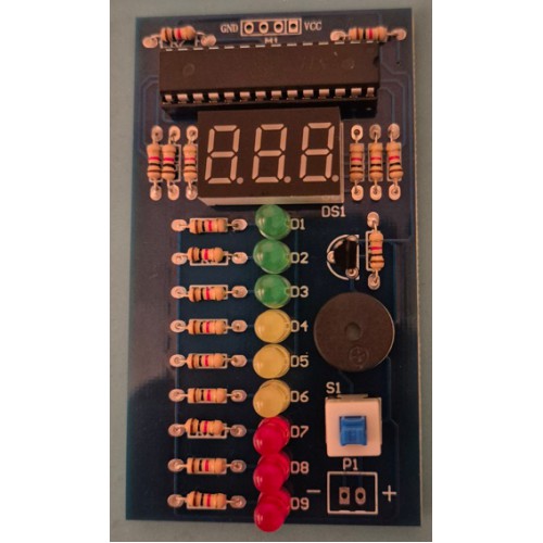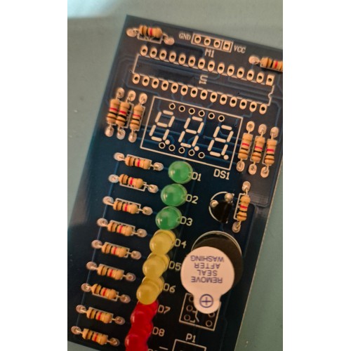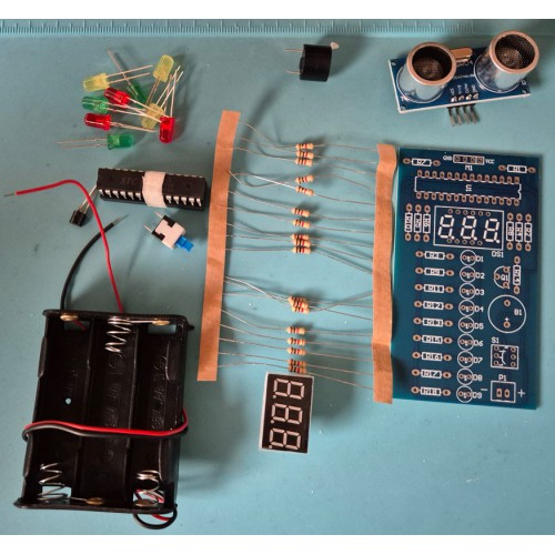 Let bij het monteren van de LED's, transistor, IC, display en zoemer op de montagerichting!
